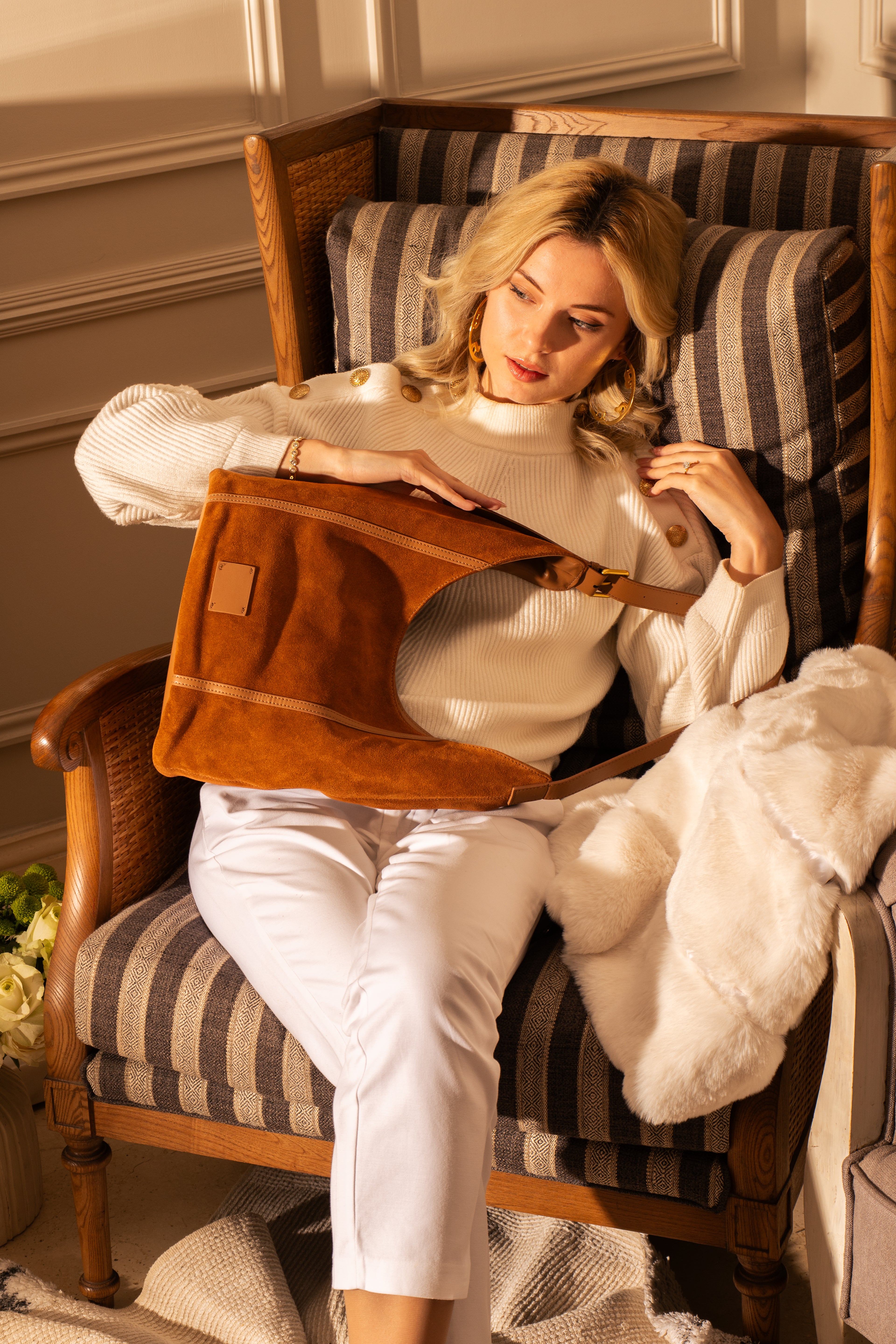Solene -Ladies suede leather bag, col. Caramel